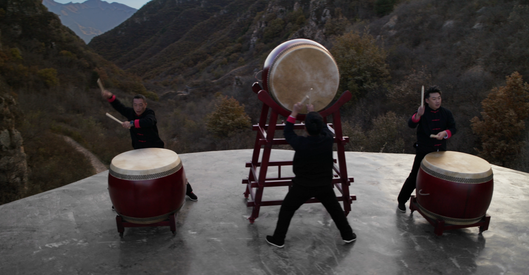 短片中,镜头始于壮阔的山河,磅礴志气呼之欲出,绵延的群山无声诉说着独属于中国的气势和文明的重量。一记鼓槌敲下,鼓音由缓至急,化为浑厚的天地之气。