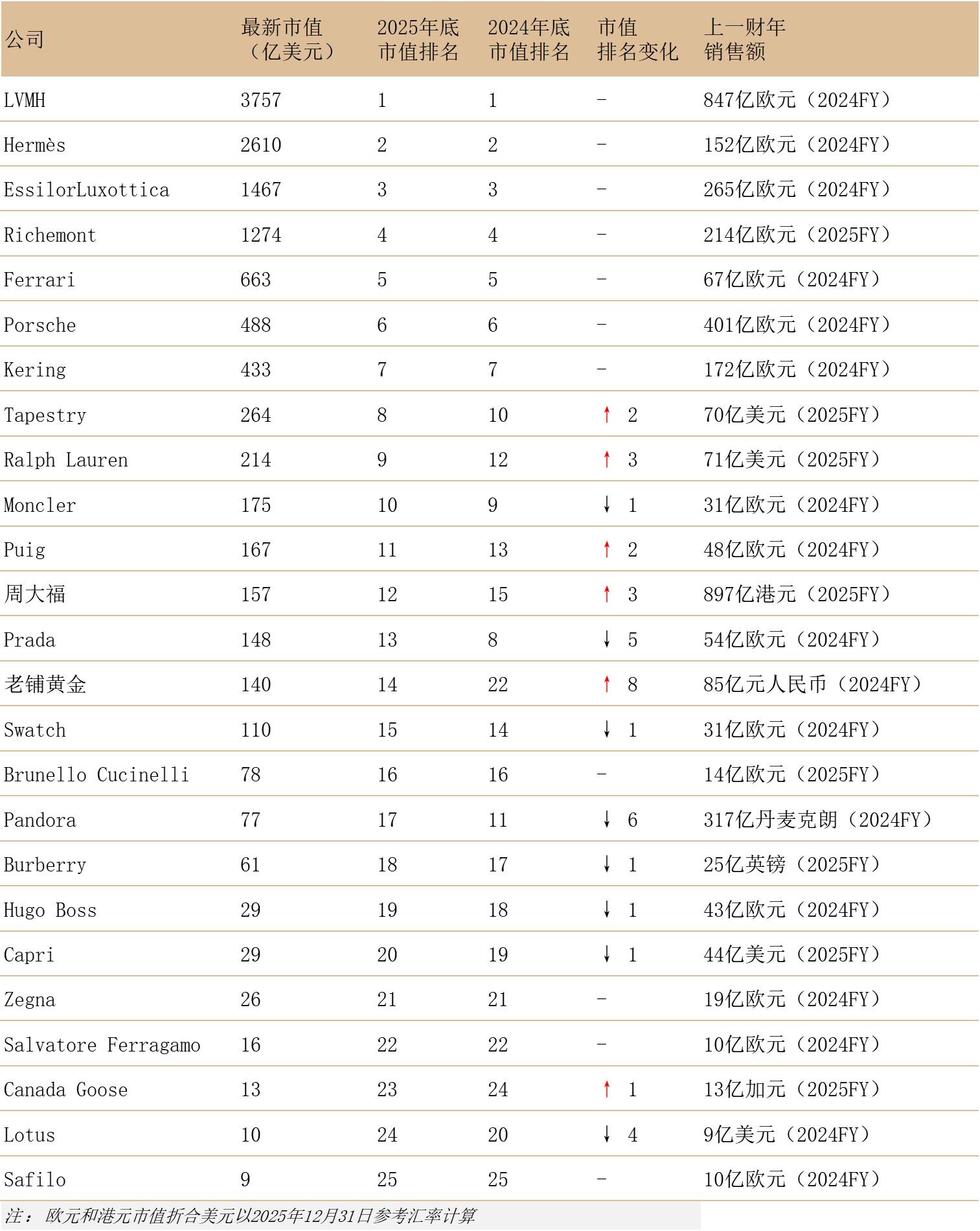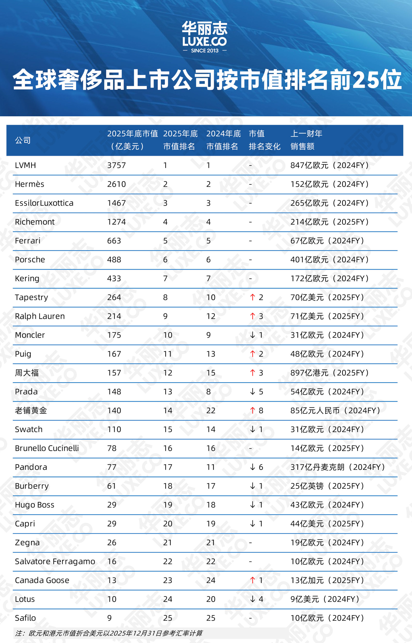 从市值规模来看,排名前七大的头部奢侈品上市公司的位次和去年一样,路易威登、迪奥、宝格丽、蒂芙尼等品牌的母公司、法国奢侈品巨头 LVMH集团蝉联第一 (尽管2025年曾一度被法国同行爱马仕超越),爱马仕排名第二,奢侈眼镜巨头依视路陆逊梯卡第三,高级珠宝和腕表巨头、瑞士历峰集团第四,两大豪华汽车企业——法拉利和保时捷分列第五和第六,古驰、圣罗兰等品牌的母公司、法国奢侈品集团开云排名第七。