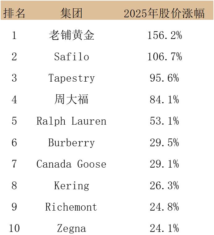 2025年度奢侈品上市公司股价涨幅 TOP 10