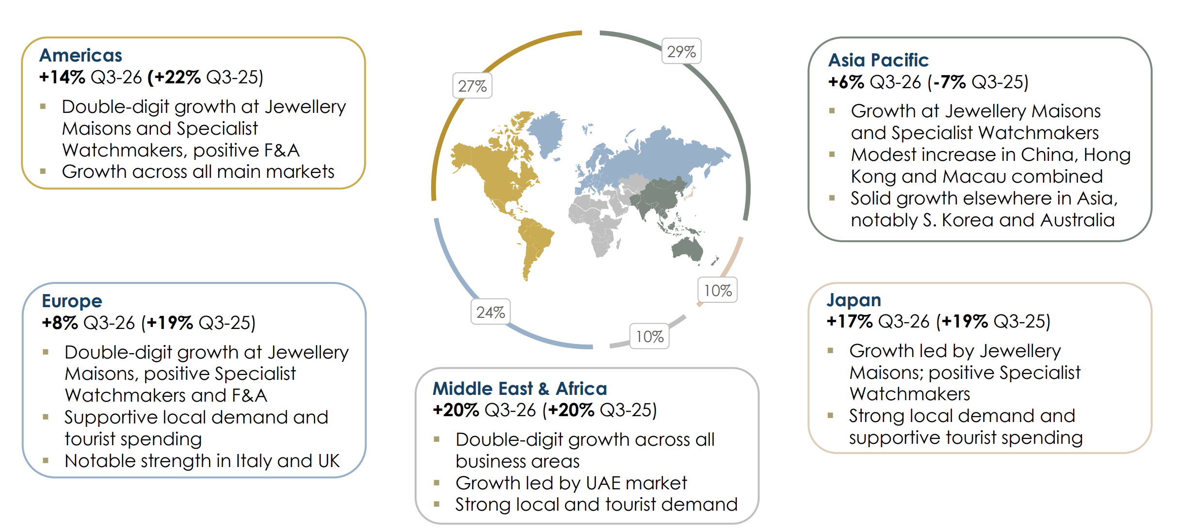 - 亚太:销售额同比增长了6%,主要由珠宝部门和专业制表部门的增长推动。值得注意的是,中国的内地、香港和澳门合计销售额同比增长了2%,主要得益于香港市场的稳健发展。亚太地区其他市场持续录得强劲增长,其中韩国和澳大利亚市场的表现依然值得关注。