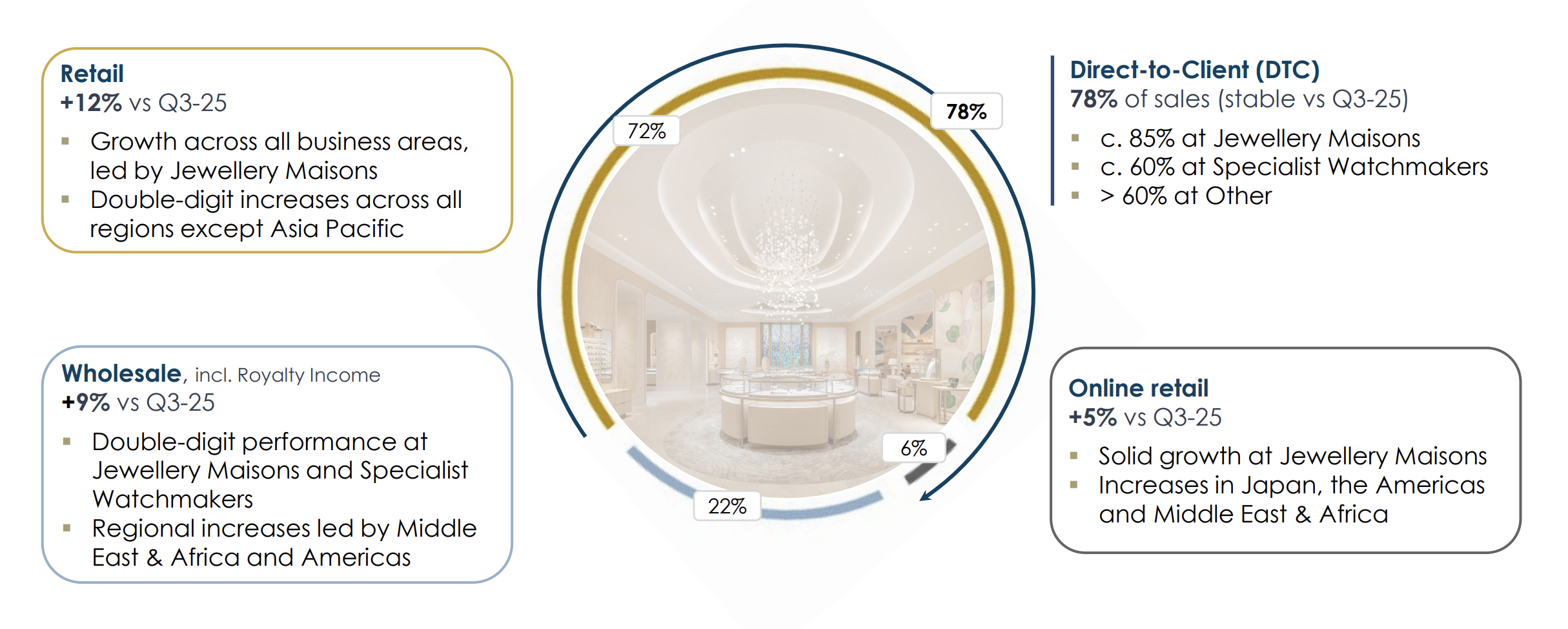 - 零售:包括集团直营店的销售额。第三财季该渠道销售额同比增长了12%,主要由珠宝部门引领,并在除亚太以外的所有地区实现了两位数增长。零售渠道仍然是集团销售的最大贡献者,占集团销售额的72%。