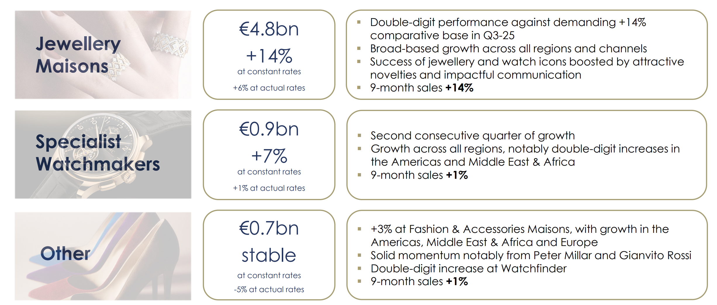 历峰集团第三财季各项业务主要亮点如下(下文除特别说明外,数据均按固定汇率计算):