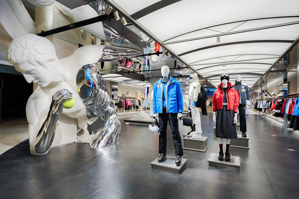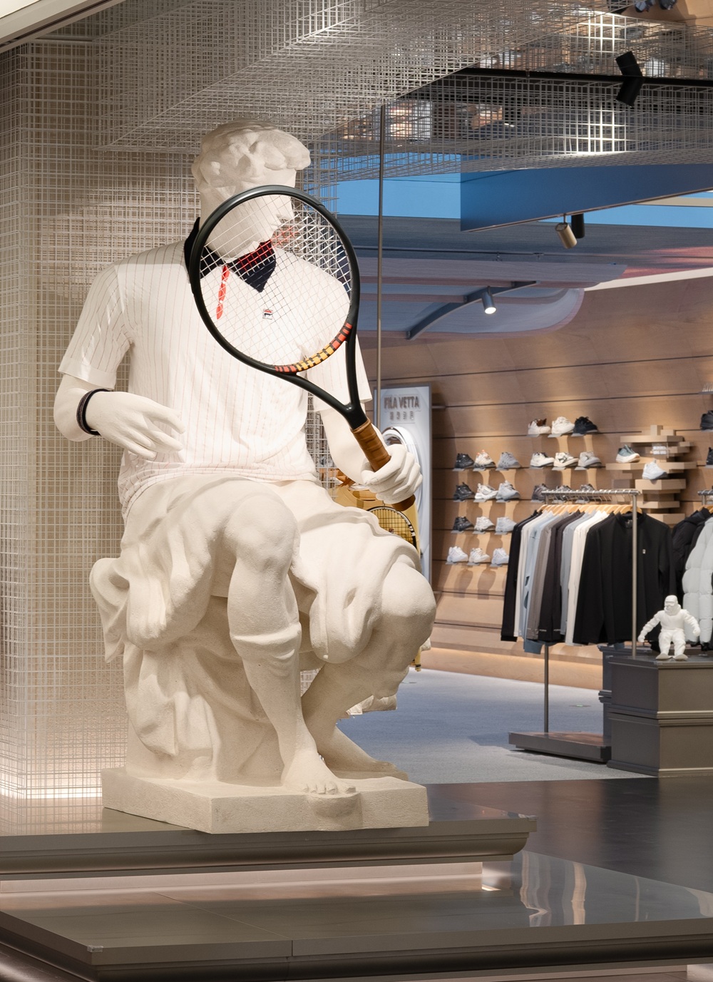 店内的门口伫立着的巨型装置以古希腊著名雕塑《掷铁饼者》为灵感,呈现手掷网球的动态;店内另一个雕塑取意自米开朗琪罗雕塑《朱利亚诺·德·美第奇像》,手持球拍,身披 FILA 经典网球单品BB1大满贯 POLO,两者共同呼应 FILA 的网球基因。