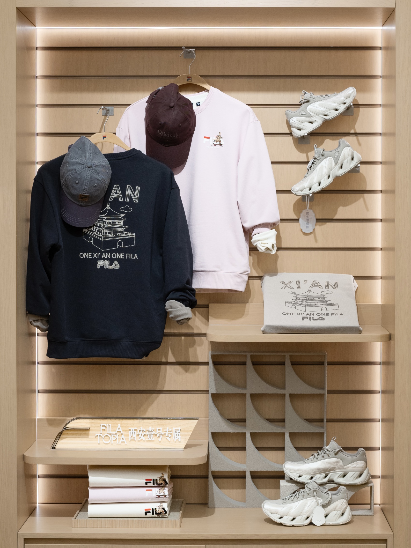 上图:FILA TOPIA 西安壹号独家甄选产品系列:“秦俑滑行”与“钟楼线影”系列卫衣、FILA VETTA SAGA老爹鞋西安赛格限定款
