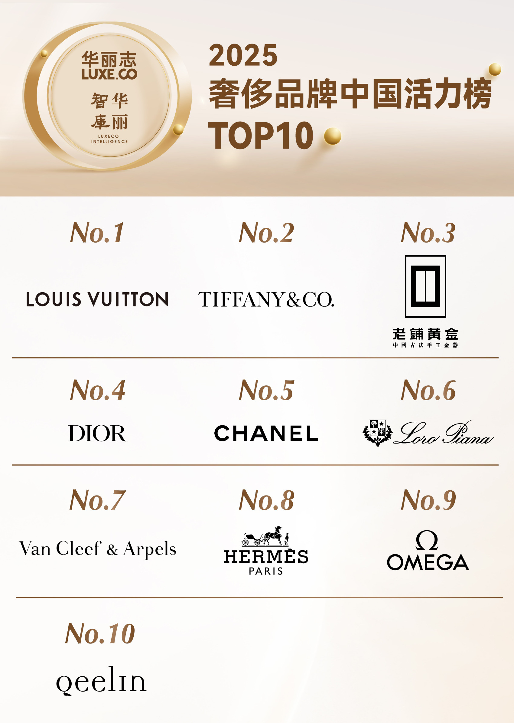 今天,我们正式发布2025年度「华丽志·奢侈品牌中国活力榜」,其中,Top 10 品牌名单如下: