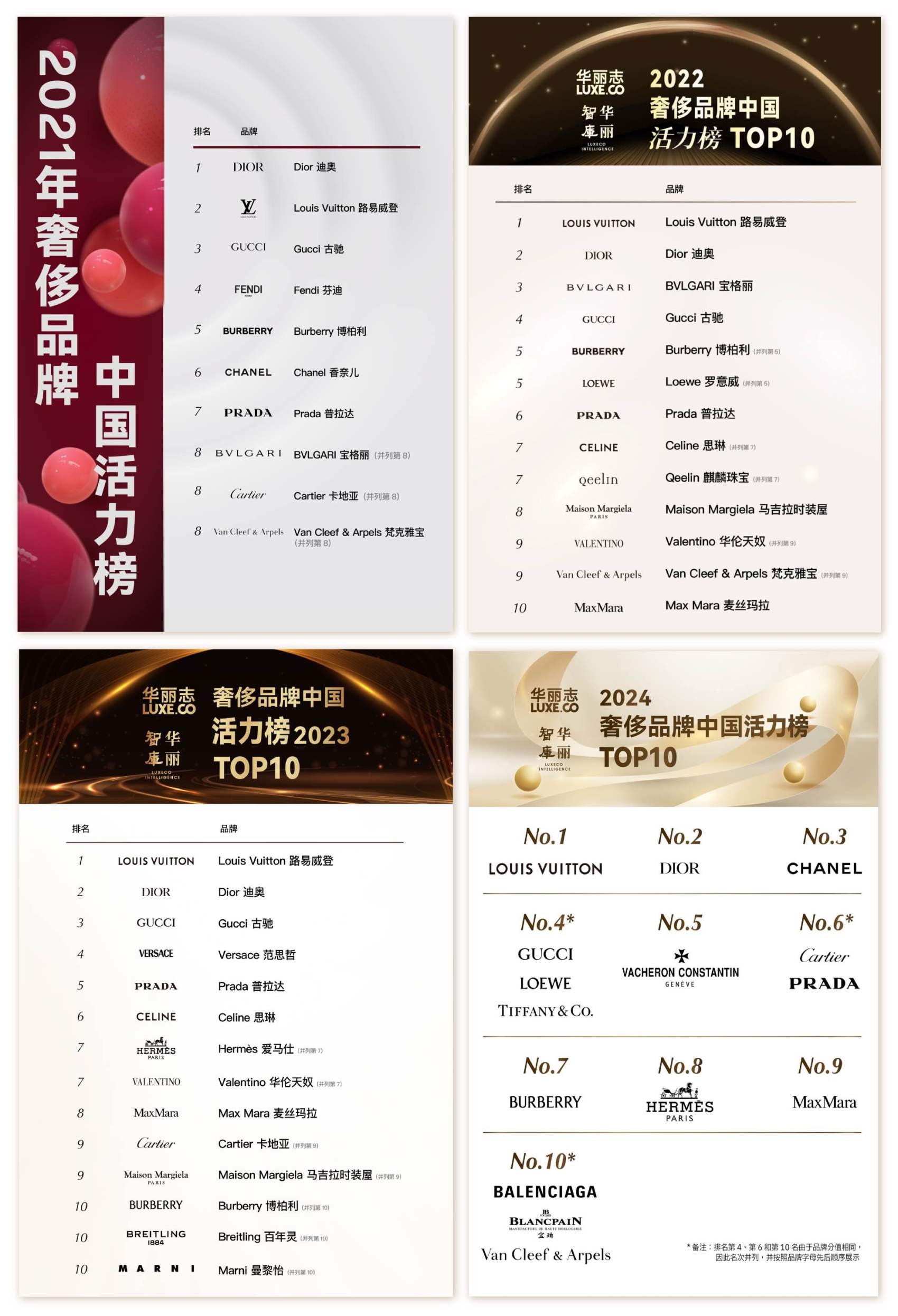 上图:2021-2024年「华丽志·奢侈品牌中国活力榜」TOP10排名