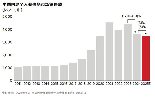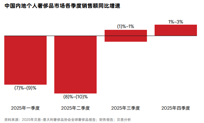 根据贝恩公司与意大利奢侈品协会(Altagamma)近期联合发布的《2025年中国个人奢侈品市场报告》,2025年中国内地个人奢侈品市场整体萎缩3%-5%,较2024年的大幅下滑(17%-19%)显著收窄,且从第三季度起显现明确复苏迹象,下半年回暖态势突出。