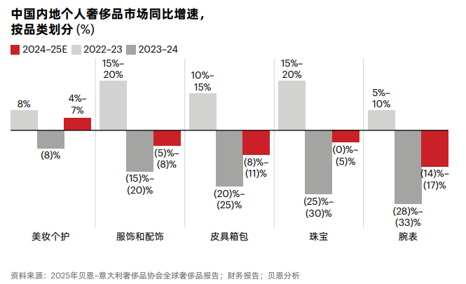不同奢侈品类在2025年在中国市场的表现差异显著,呈现高度分化格局: