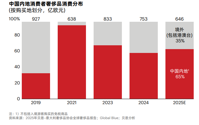 2025年中国奢侈品消费进一步向境内回流,境内市场占比65%,海外消费占比降至35%,远低于疫情前水平。
