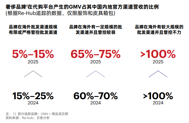 ——海外批发渠道规模有限或严格管控的品牌,2025年其代购销售额占内地官方渠道营收的比例从2024年的15%-25%降至5%-15%;