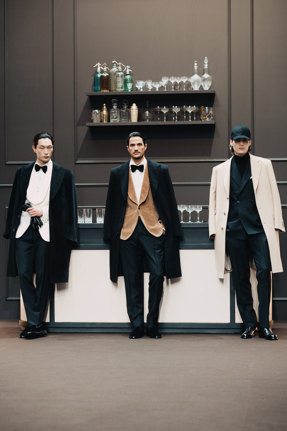 此次大秀以「A FAMILY CLOSET 家的衣橱」为主题。秀场现场被巧妙布置成一个引人遐想的家庭衣橱,陈列着来自杰尼亚集团执行董事长 Gildo Zegna,与同为家族第三代成员 Paolo Zegna 的私人物品。衣橱内设有博物馆式玻璃展柜,典藏杰尼亚于1930 年代制作的首套西装“ABITO N.1”——为创始人 Ermenegildo Zegna 伯爵量身定制。以此为载体,家族世代的身影映射在衣物上,从而演变为一种独特的传承。
