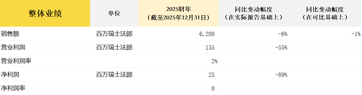 1月30日,瑞士高级钟表巨头 Swatch Group(斯沃琪集团)发布截至2025年12月31日的2025财年关键业绩数据: