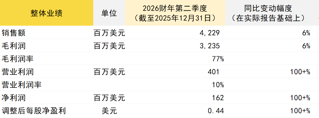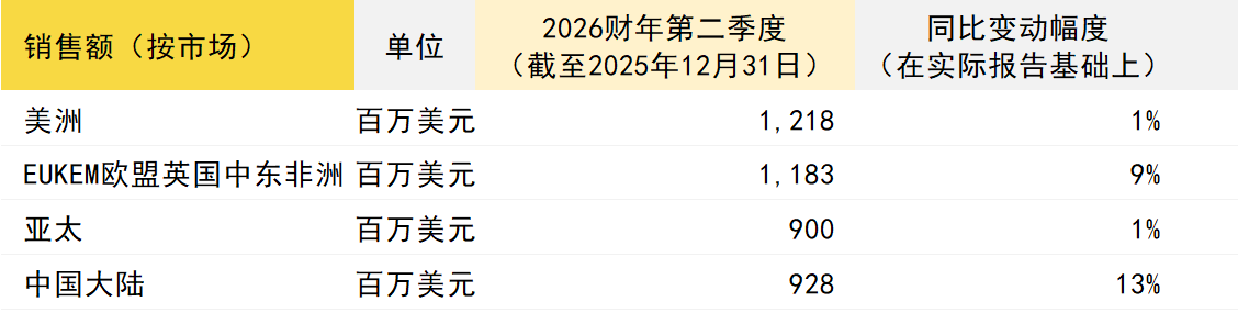 第二财季实现净销售额42.29亿美元,较上一财年同期增长6%。值得一提的是,集团已彻底扭转上年同期5.9亿美元的亏损局面,在本季度实现1.62亿美元盈利。上半财年,集团营收77.1亿美元,较上年同期增长5%,同时亦扭转了上年同期的亏损局面,实现2.09亿美元盈利。