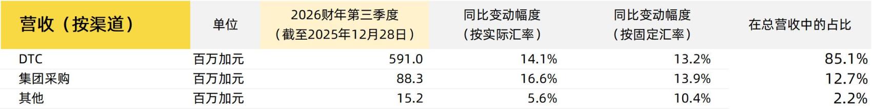 在全域收入强劲增长的推动下,直营(DTC)渠道营收同比增长14.1%至5.91亿加元,其中,直营(DTC)渠道可比销售额同比增长6.3%,这已是该渠道连续第四个季度实现正增长。