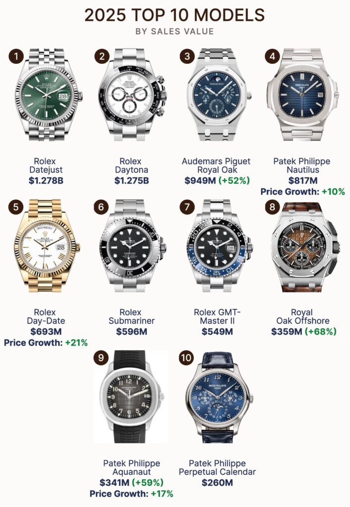 劳力士继续占据主导地位,2025 年的总价值达到 57 亿美元;百达翡丽以 22 亿美元的销售额位居第二;爱彼以 16 亿美元位居第三;Omega(欧米茄)以 6.97 亿美元位居第四;Richard Mille 以 6.72 亿美元位居第五。