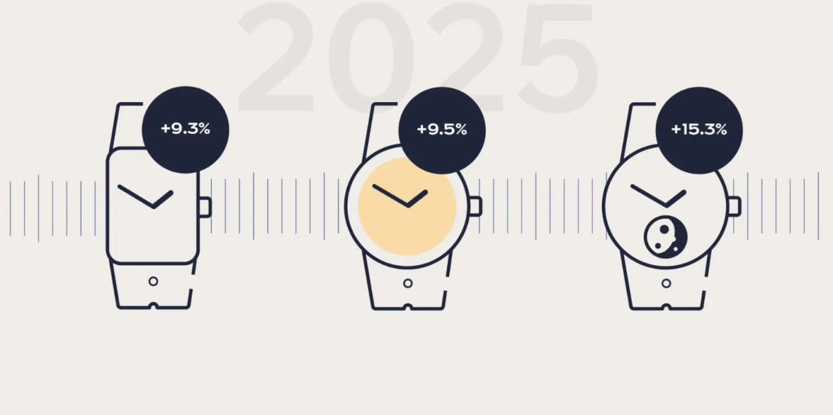在形状偏好方面,与2024年相比,矩形表壳的需求增长了9.3%,挑战了圆形表壳的普遍地位。