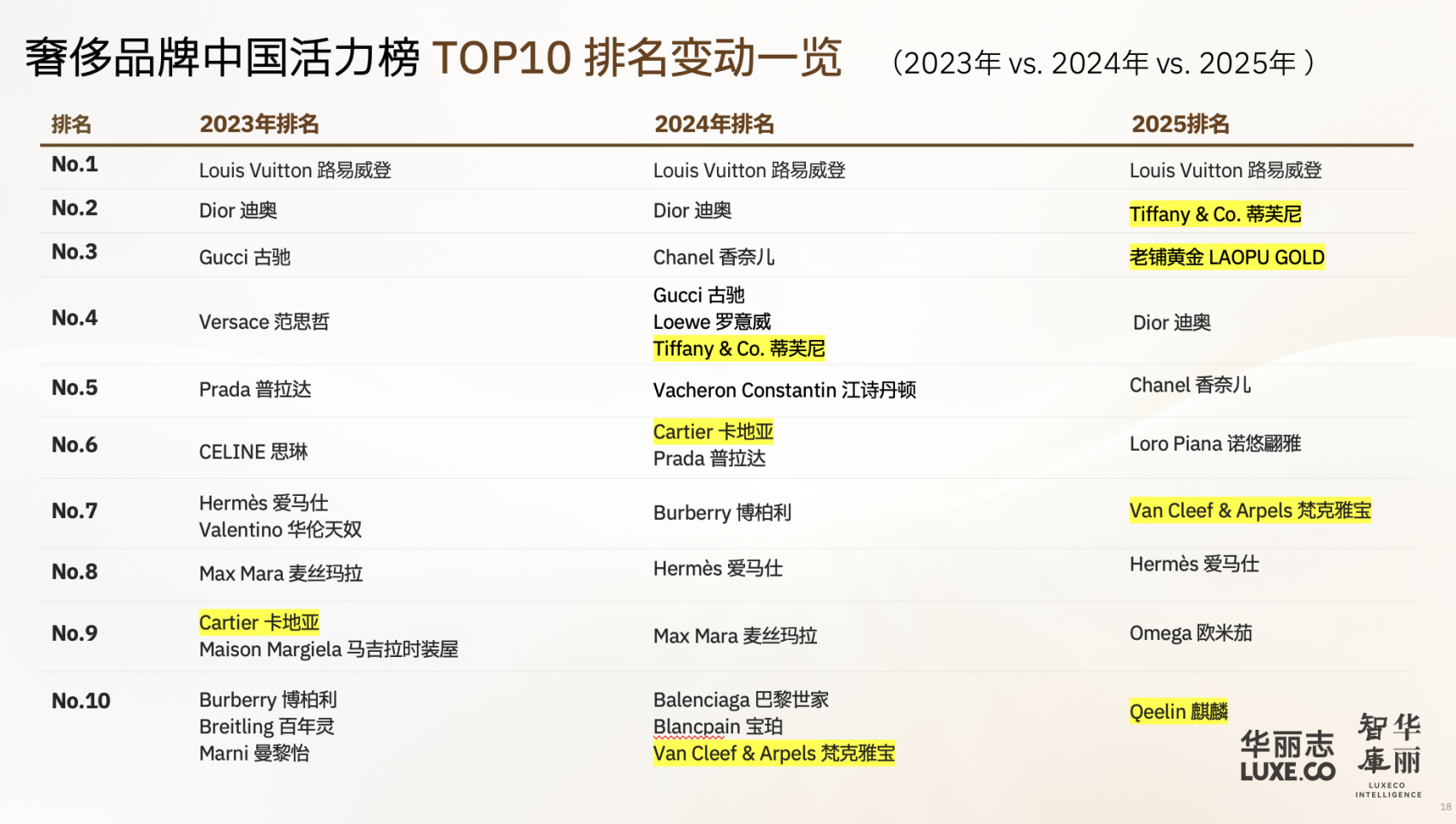 过去三年,华丽志“活力榜”排名的变化直观地反映了这一趋势,高端珠宝品牌在 TOP 10 中的数量,从 2023年的 1个,增长到 2024年的 3个,2025年的 4个(Tiffany&Co.蒂芙尼,老铺黄金、Van Cleef &Arpels梵克雅宝,Qeelin 麒麟)。