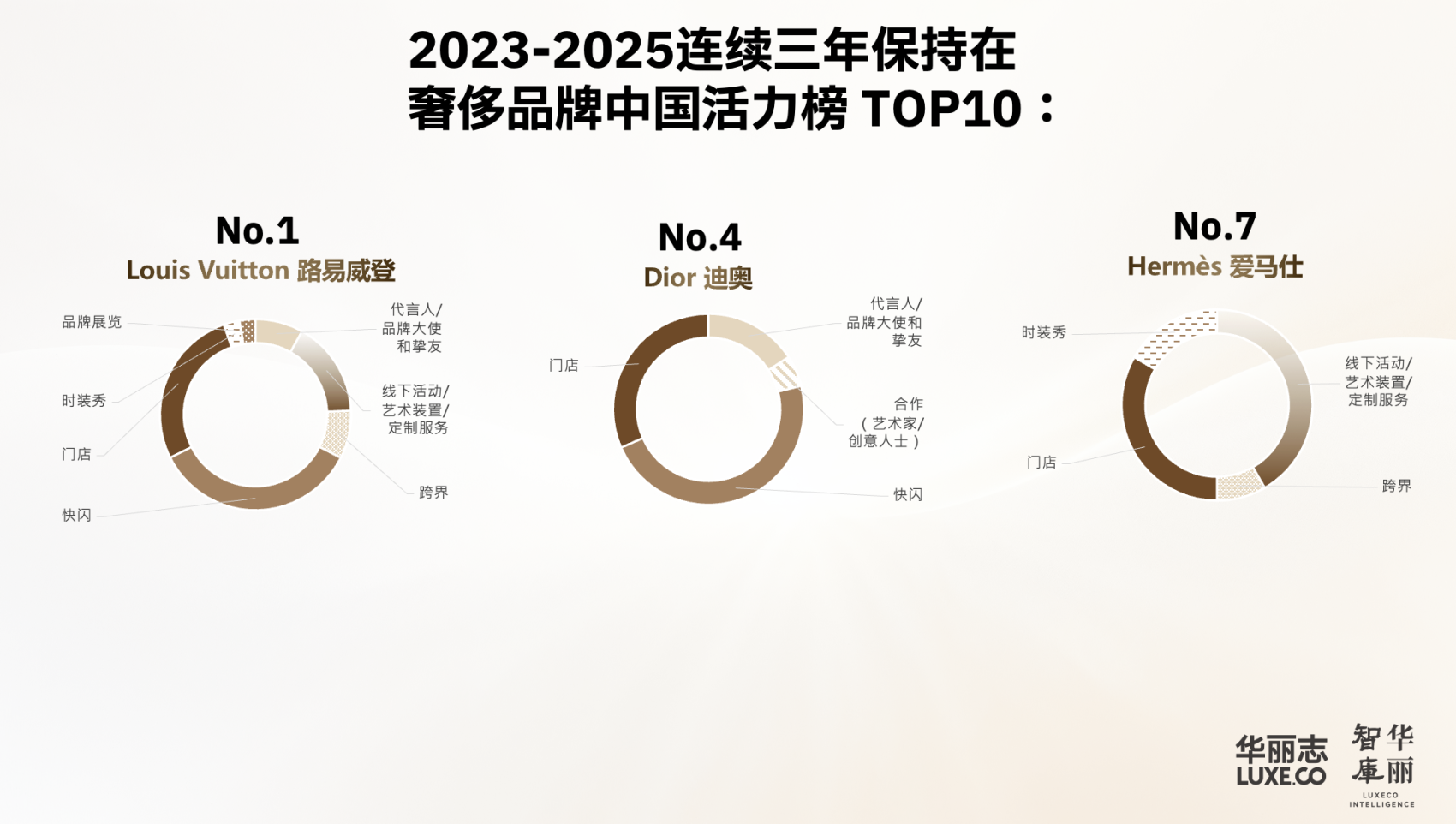 尽管深陷寒冬,但奢侈品界地位最高的“头部”品牌们依然保持了在中国市场的投入力度和活跃度:Louis Vuitton 路易威登、Dior 迪奥、Hermès 爱马仕 都连续三年登上“活力榜” Top 10。