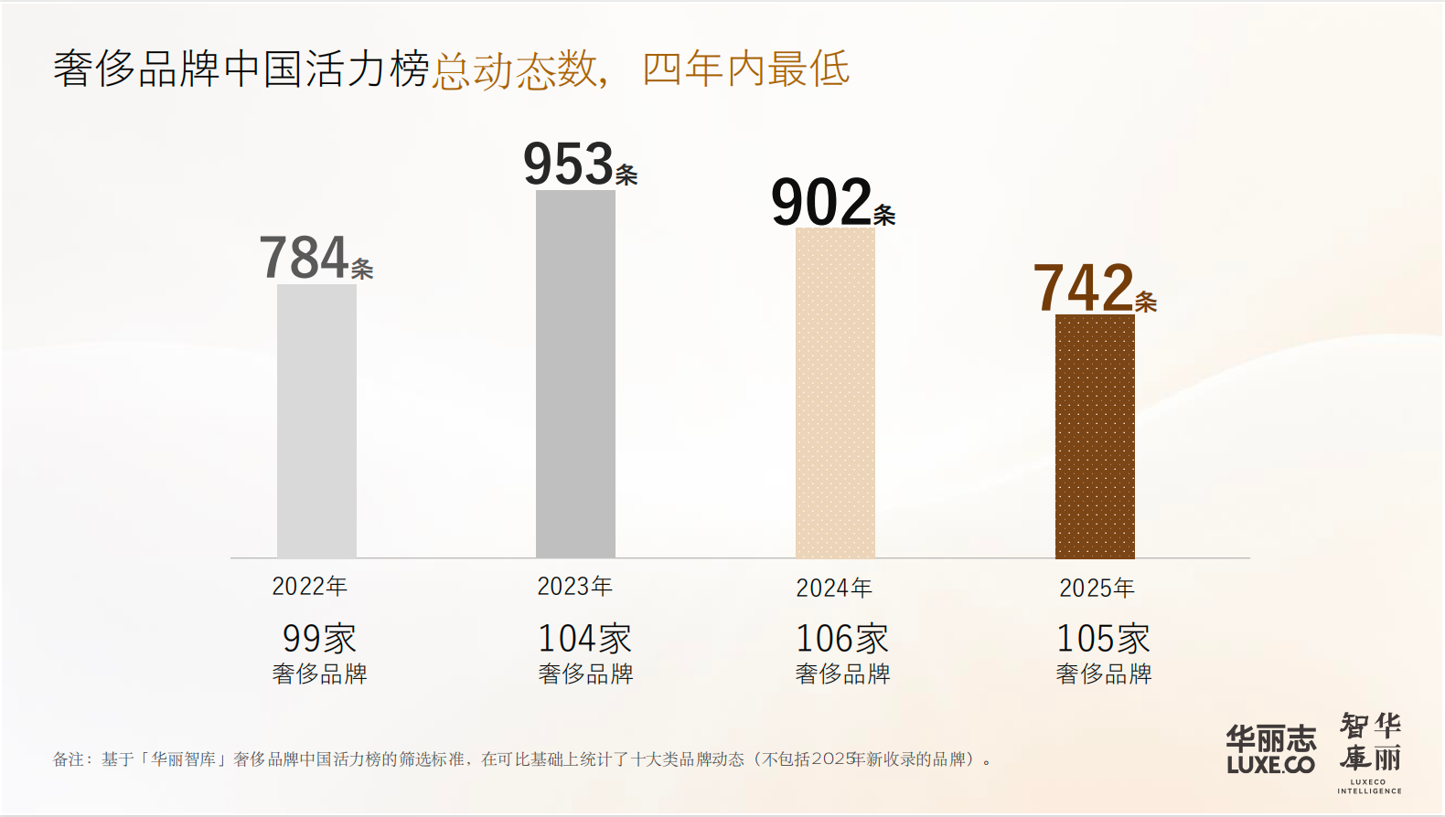 2025年度“活力榜”共收录了105家奢侈品牌在中国市场发生的742条动态,为过去四年来最低,甚至低于疫情尾声的2022年。