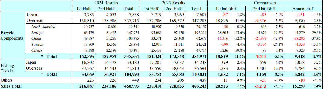 日本自行车零部件和渔具生产商 Shimano(禧玛诺)公布了截至12月31日的2025财年全年业绩数据:净销售额比上年增长3.4%至4662.43亿日元(约合人民币207亿元);营业利润下降20.6%至516.77亿日元;归母净利润下降55.5%至339.91亿日元。