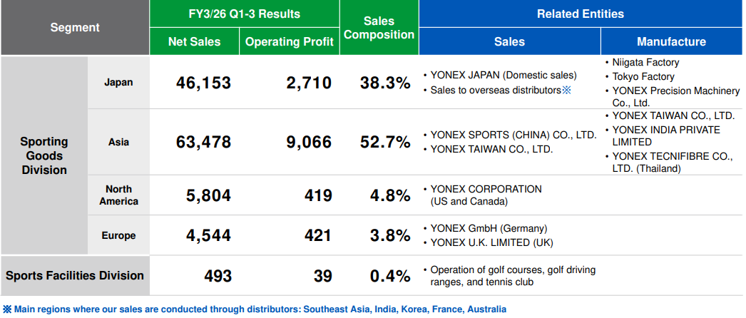 得益于 Yonex 团队运动员的出色表现,品牌在欧洲的知名度有所提升,从而带动了网球产品(主要是球拍)的销量增长。羽毛球方面,在国际赛事持续推动下,市场对该运动的兴趣保持稳定,球拍和线绳的销量均有所增长。