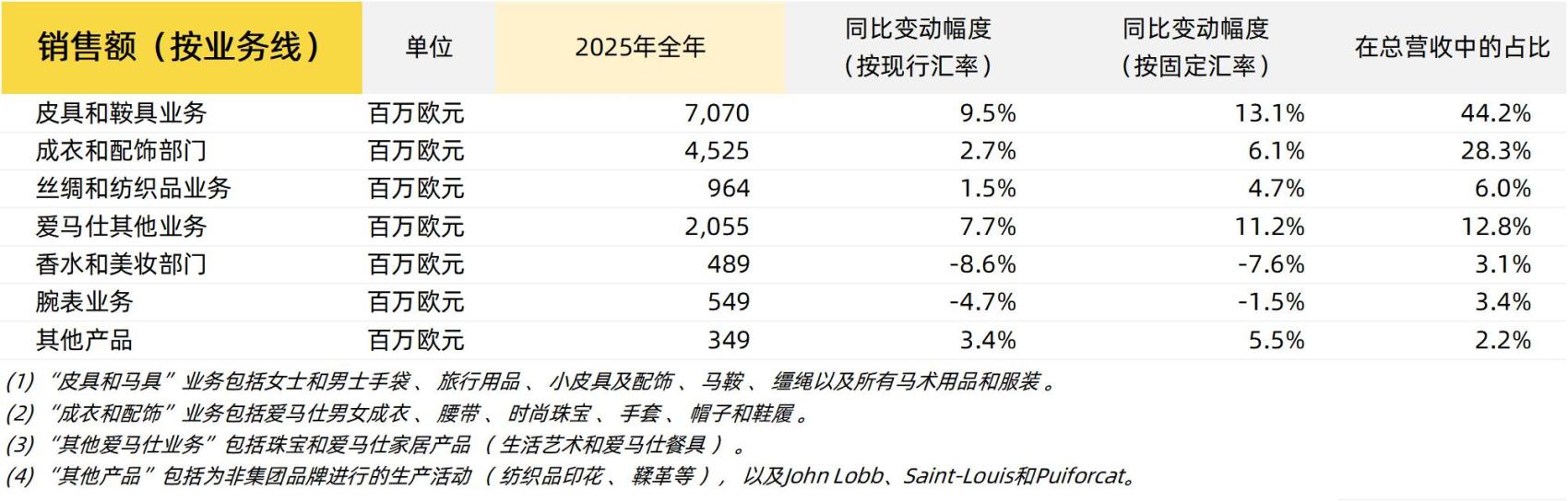- 成衣与配饰部门(+6.1%)确认了其强劲势头。分别于6月在耶纳宫(Palais d’Iéna)和10月初在共和国卫队总部(Garde Républicaine)发布的 2026 年春夏男装和女装成衣系列反响热烈。由担任爱马仕男性世界艺术总监 37 年的 Véronique Nichanian 设计的最新 2026 年秋冬男装系列于 2026 年 1月底在布隆尼亚尔宫(Palais Brongniart)发布。