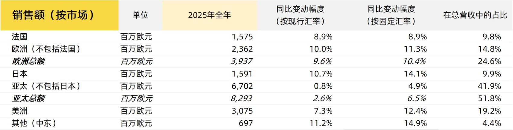 其中,以中国为首的亚太区(不包括日本)按固定汇率计算的销售额也实现了4.9%的增长(按当前汇率计算增长0.8%),贡献了全球销售额的41.9%。
