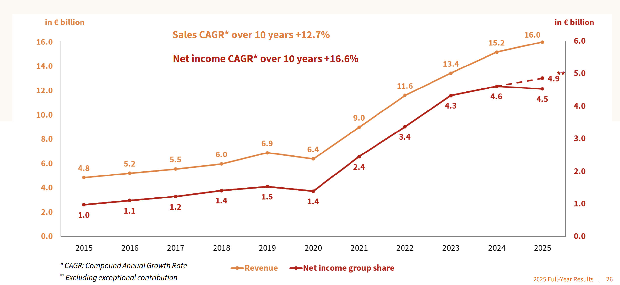 就盈利能力而言,爱马仕2025年经常性营业利润达到 66 亿欧元,尽管受到汇率效应的负面影响,经常性营业利润率仍有所提高,达到 41%,而2024年为40.5%。此外,集团净利润同比增长5.5%达到48.6亿欧元(排除针对法国大型企业利润的额外税收),与营收增长同步。