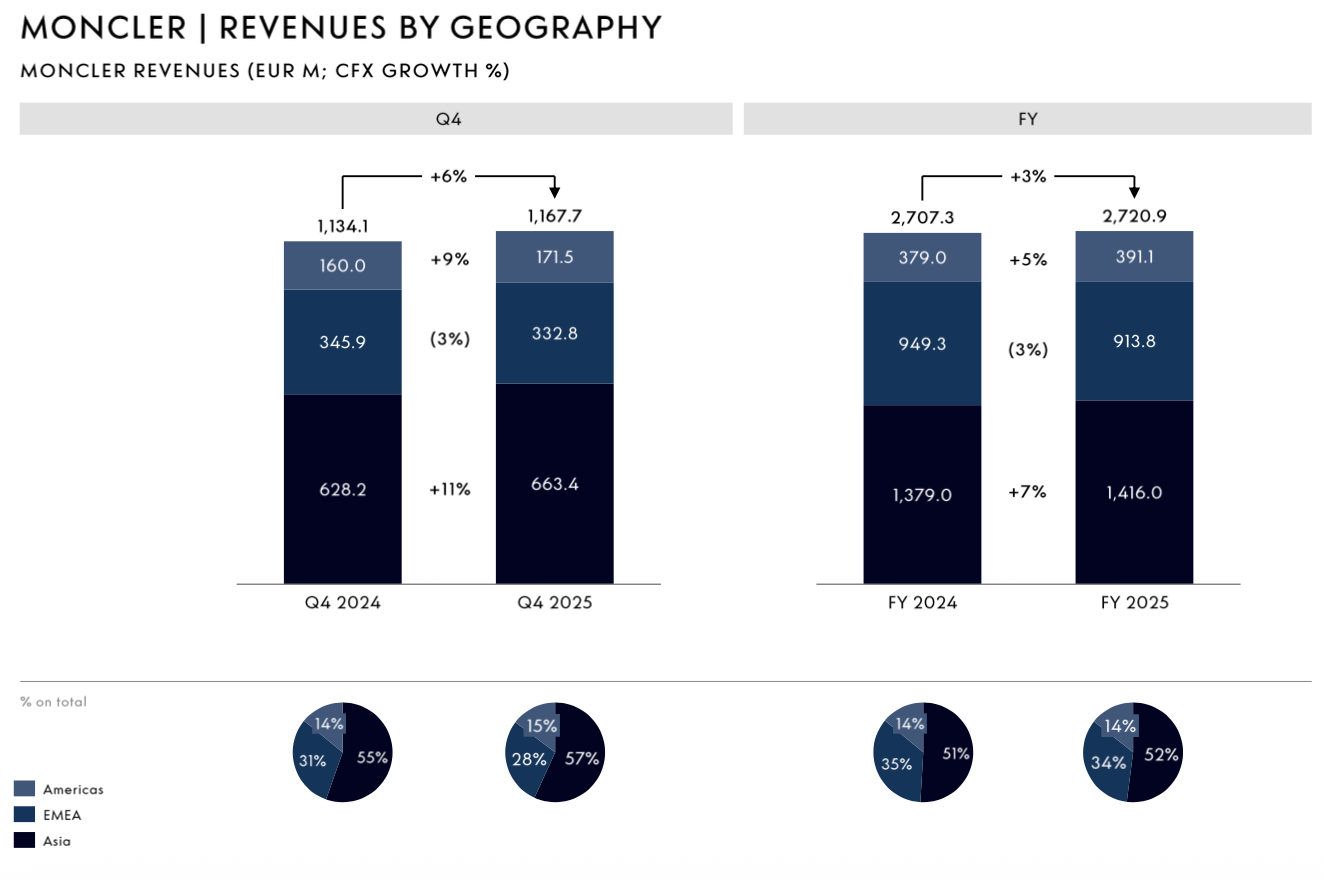 2月19日,意大利奢侈品集团 Moncler Group(盟可睐集团)发布截至2025年12月31日的全年财报:总营收比上年增长1%至31.32亿欧元(按固定汇率计:+3%),净利润下滑2.02%至6.27亿欧元;合并毛利润为24.462亿欧元,毛利率为78.1%,与2024年持平。