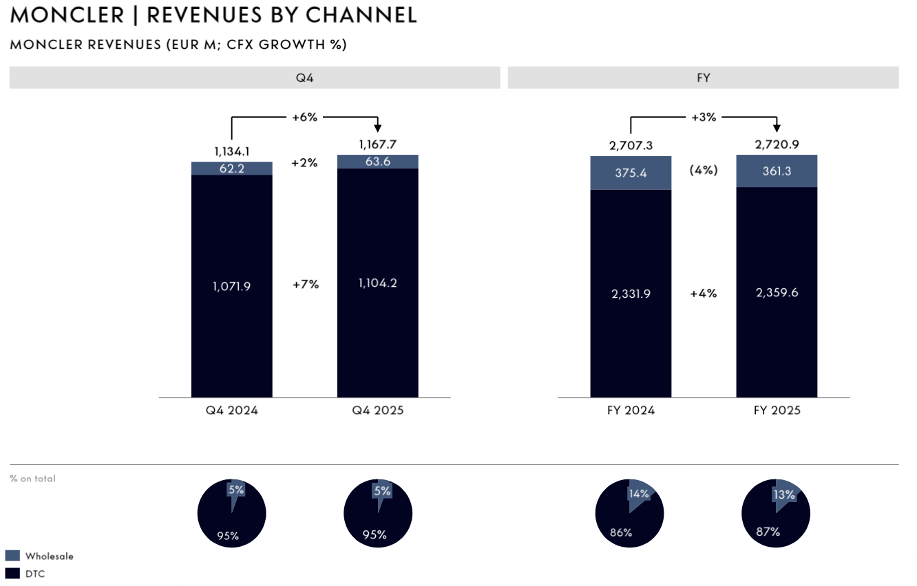 截至12月31日,Moncler 单品牌直营店网络共计295 家,较2024年同期净增9家。第四季度重点动作包括韩国光教店开业,以及美国西雅图门店扩建。Moncler 品牌同时运营49家单品牌批发门店,较去年同期净减7家。
