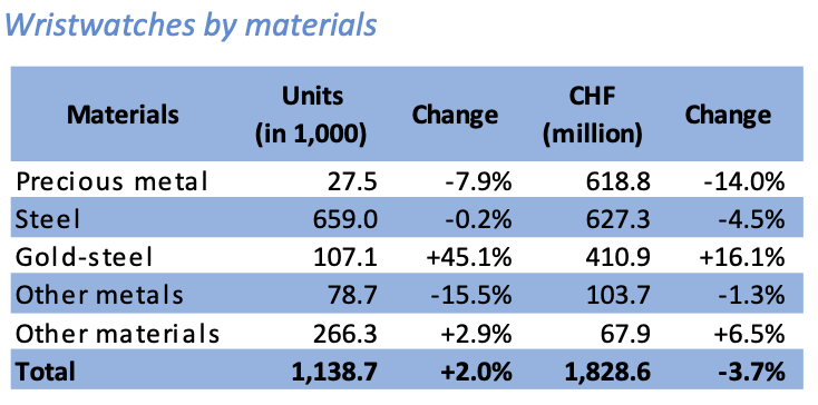 1月,不同材质的瑞士手表出口额的具体表现如下:
