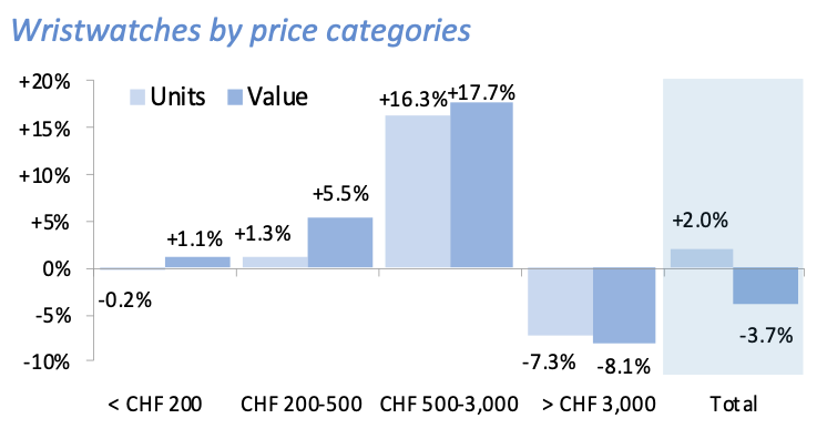 - 价格在 3000瑞士法郎以上的手表出口量同比下滑7.3%,出口额同比下滑8.1%