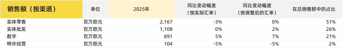 - 实体零售(包括独立品牌门店、店中店及折扣店):全年销售额与上年持平,主要反映了中国和英国等核心市场的低迷客流。但在第四季度,受益于成功的假日季节以及高影响力品牌举措,实体零售恢复增长,销售额增长2%,同店销售额亦有适度增长。