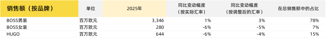 - BOSS女装与HUGO:为了长远发展,公司在2025年采取积极措施精炼品牌定位并精简产品线,使得两者的销售额分别下降5%和4%。