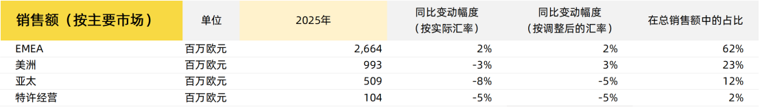 - EMEA(欧洲、中东及非洲):销售额在2025年增长2%,主要受德国和法国市场驱动。第四季度更是加速增长9%。