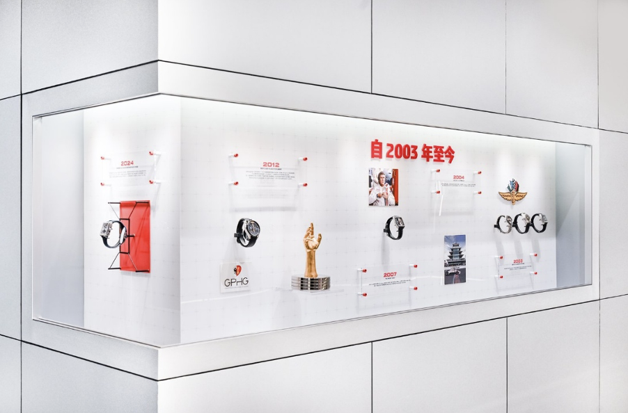展区呈现泰格豪雅自2022至2024年对 “先锋制表”(Avant-Garde Horlogerie)理念的持续探索。2024年推出的巅峰之作——摩纳哥系列双秒追针计时码表,搭载品牌与顶级机芯厂Vaucher联合研发的TH81-00全钛金属机芯。通过结构性运用5级钛金属与蓝宝石水晶,腕表营造出极具通透感的视觉效果;机芯经手工精细打磨,饰以品牌专属棋盘格纹,成为泰格豪雅历史上首枚机械双秒追针计时码表。这一精密机械与前卫美学的深度融合,标志着品牌正式迈入高端复杂功能制表的新纪元,印证了真正的奢华源于技术深度与审美胆识的同频共振。