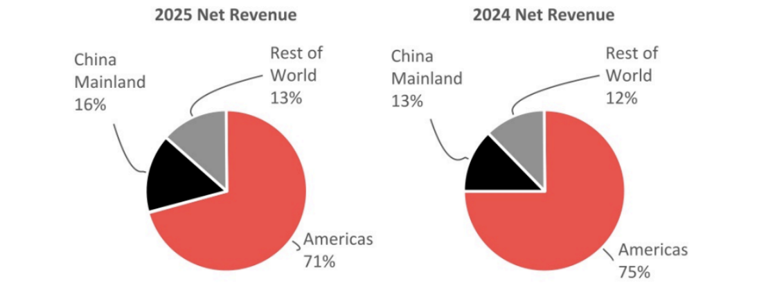 - 中国大陆市场:2025财年全年净营收达到 17.55亿美元,同比大幅增长29%。值得注意的是,中国大陆市场在品牌全球总净营收中的占比已由2024财年的13%跃升至2025财年的16%。在第四季度,中国大陆业务净营收同比增长24%。