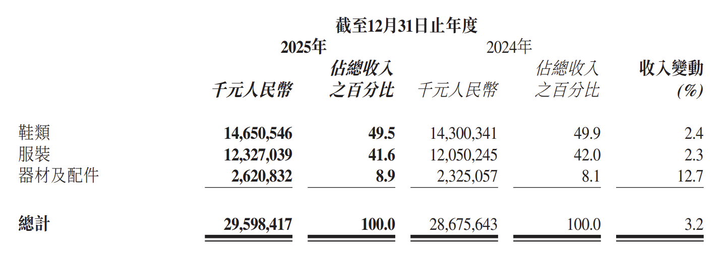 - 鞋类:营收同比增长2.4%至146.51亿元,占总营收的比重由49.9%降至49.5%。