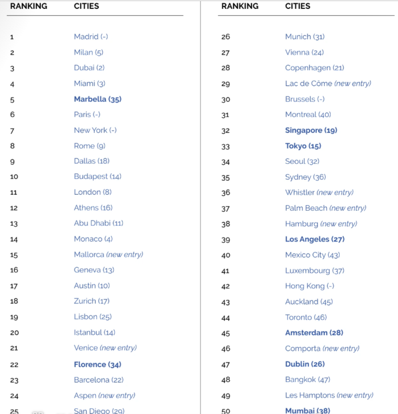 前五榜单中,马德里连续第二年位居榜首。排名第二的米兰进一步巩固了其作为意大利经济发展引擎的地位,同时彰显出独树一帜的生活美学。
