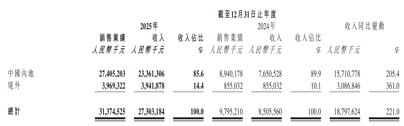 中国内地营收为233.61亿元,占比85.6%,同比增长205.4%。受益于境外渠道持续拓展和品牌全球影响力的持续扩大,2025年境外营收高达39.42亿元,较2024年大幅增长约361.0%,营收占比提升至14.4%,这与集团“品牌国际化、市场全球化”的发展战略一致。