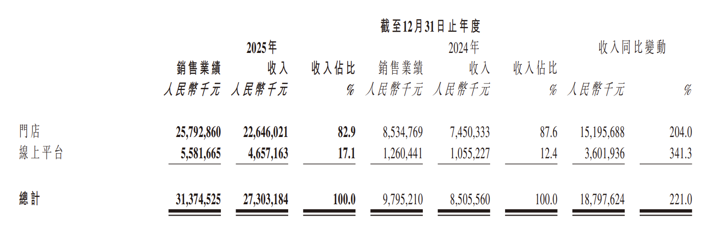老铺黄金的产品销售以线下门店渠道为主,门店营收占总营收约82.9%,达226.46亿元。同时,线上平台是销售渠道的有力补充,2025年线上平台产生的营收约为46.57亿元,同比大涨341.3%,占总营收约17.1%(2024年占比为12.4%)。此外,2025年集团同店年营收增长率约为160.6%。