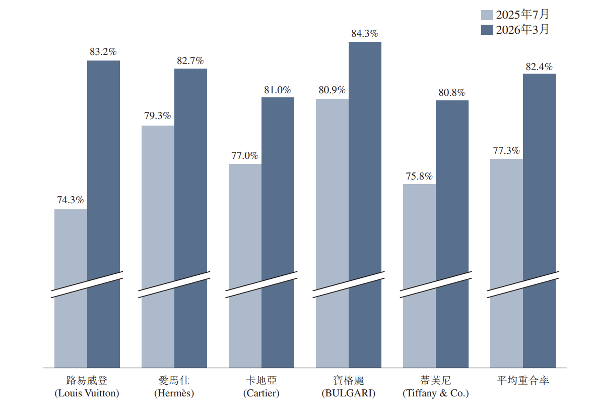 - 消费客群:截至2025年12月31日,忠诚会员达到约61万名,相较2024年底增长26万名,增幅达74.3%,消费人群持续扩大。老铺黄金的客群与路易威登、爱马仕、卡地亚、宝格丽等国际五大奢侈品牌的消费者平均重合率从2025年7月的77.3%提升至2026年3月的82.4%。