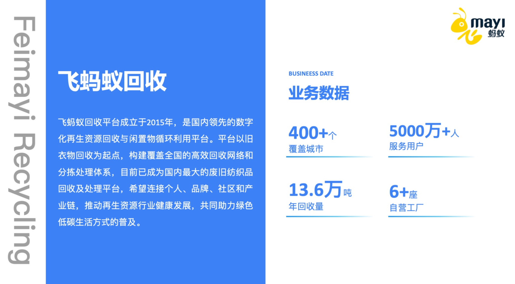 马云:我从2015年开始创业做“飞蚂蚁”回收平台,我们想用极致的服务,推动更多人参与到旧衣服、即废旧纺织品的回收以及再利用中来。这些年我们也在后端不断深入,建立了整个废旧纺织品的分拣以及再处理的体系,在全国自建6座自营工厂,上门回收服务基本覆盖了全国一二三线城市。我们也有很多合作的服装品牌,包括UR、阿迪达斯、斯凯奇等等。