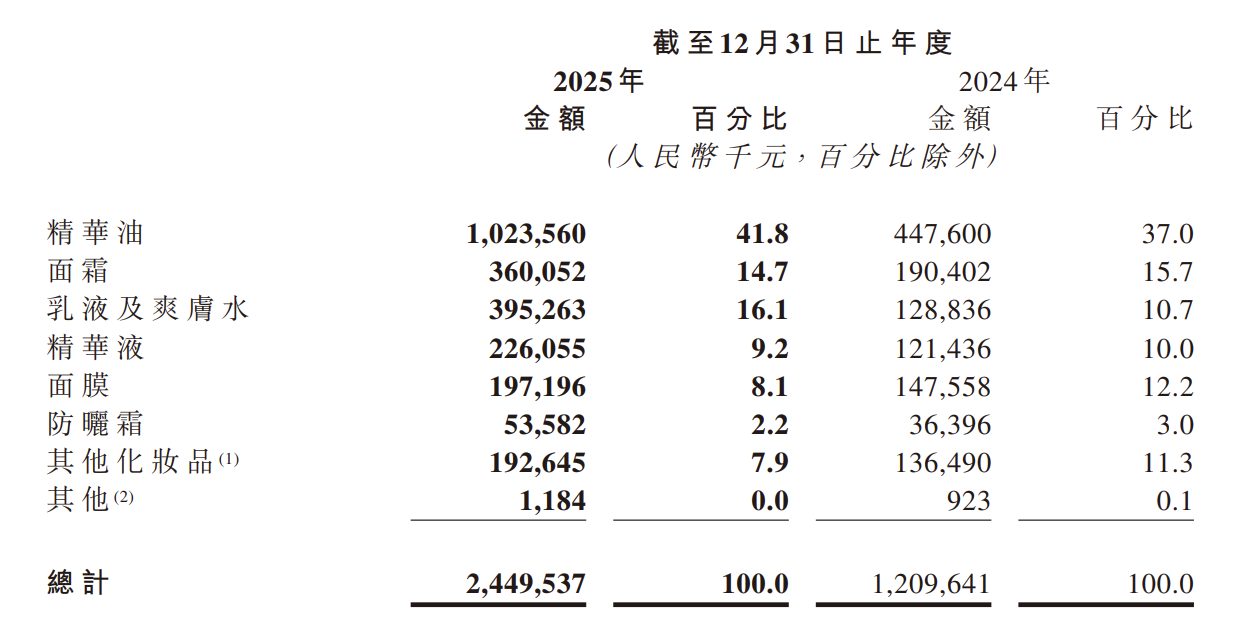 - 精华油(核心大单品):实现营收10.24亿元,占总营收的41.8%(2024年为37.0%),毛利率高达86.2%。其中,第五代山茶花抗皱修护精华油自2014年推出以来累计销售逾5500万瓶,连续12年稳居全国面部精华油榜首。