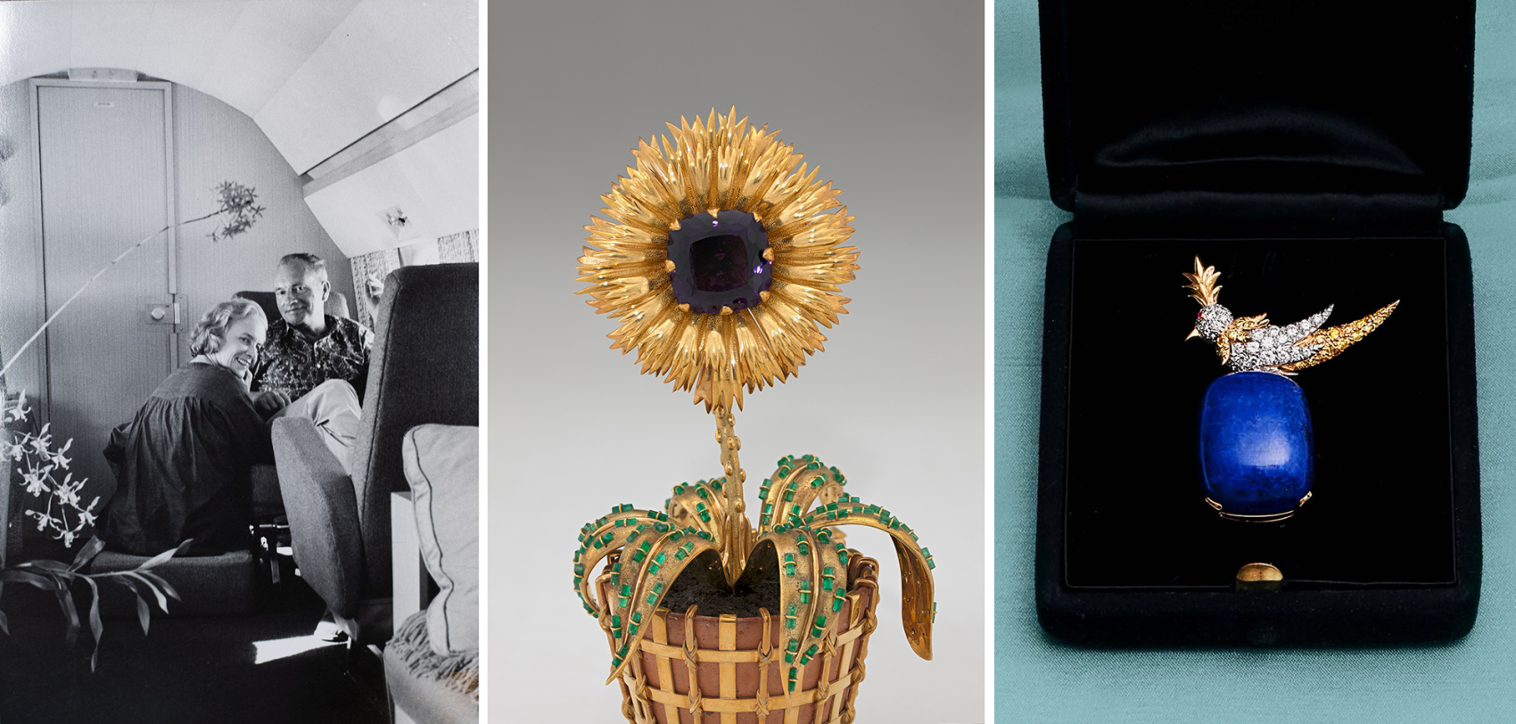 史隆伯杰曾以旅途中偶遇的黄色凤头鹦鹉为灵感,创作了经典的“石上鸟”,邦妮·梅隆是首批“石上鸟”胸针的拥有者之一。史隆伯杰为她定制的“花盆珠宝摆件”,生动地还原了花盆和泥土质感。