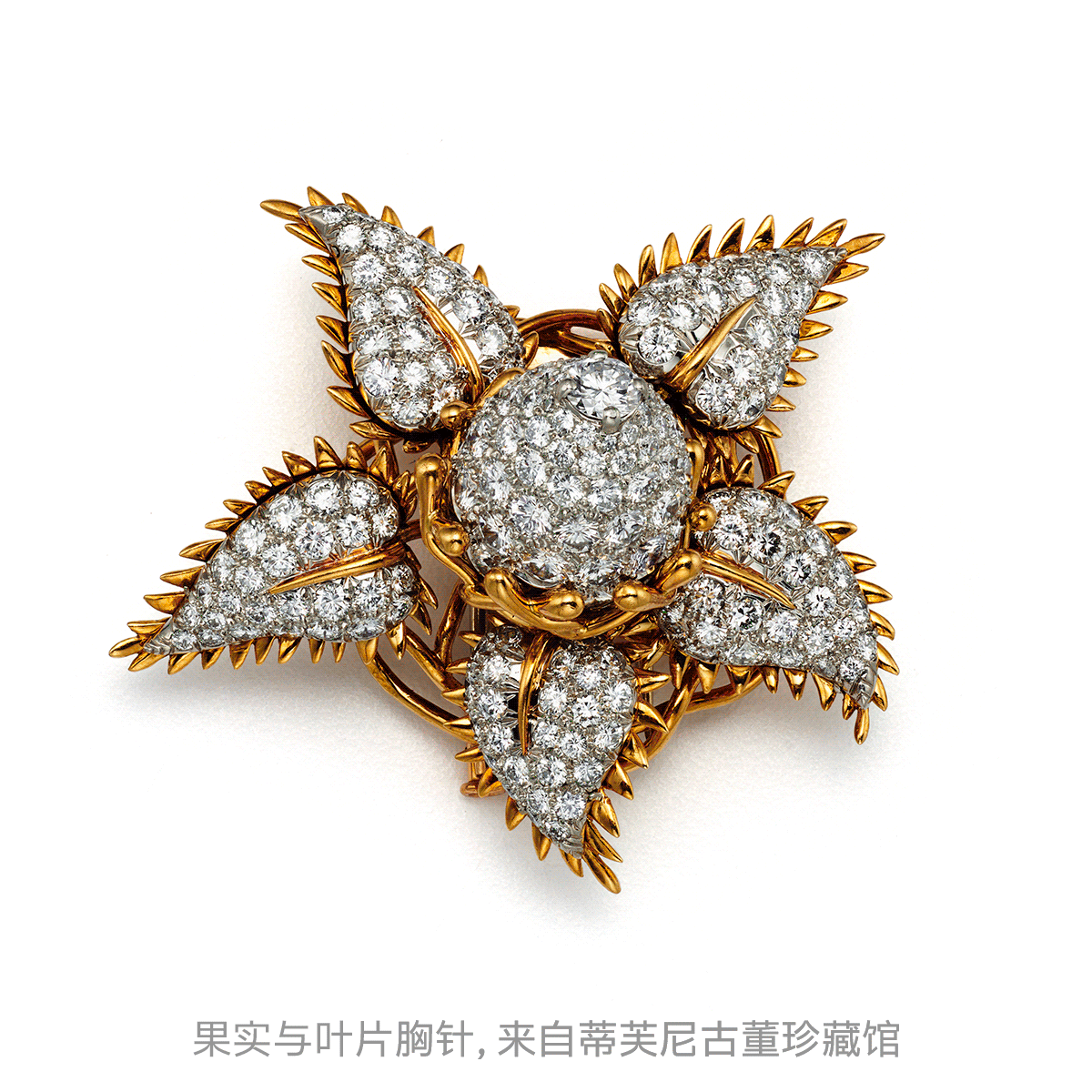 他深谙大自然那种未经人为干涉、天然纯粹的生长规律。“果实与叶片胸针”利用可自由翻转的叶片结构,模拟出植物从花朵到果实的成熟过程;另一枚“胸针”上,七片独立的叶片均可180度旋转,仿佛自然循环的舞蹈,触动着观者基因中对生命秩序的深层记忆;“刺果番荔枝胸针”则以多刺心型形态提炼出释迦果的独特特征,粉色蓝宝石如同果肉晶莹剔透,自然万物仿佛在宝石中继续生长。