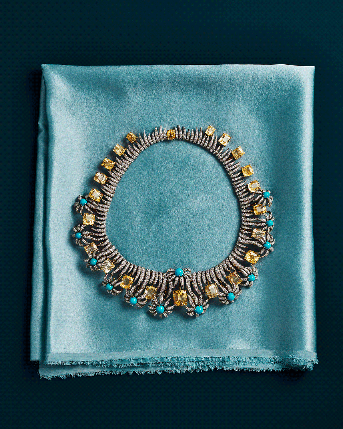 这种以彩色宝石作画的思路在创作于1960年的“树篱与花列项链”中得到了完美诠释。二十二颗黄色蓝宝石环绕排布,其间点缀十三颗绿松石,色彩明丽且富有节奏感,黄金化作了土地、枝干与阳光,而璀璨的彩色宝石则如同季节与生命的显现。