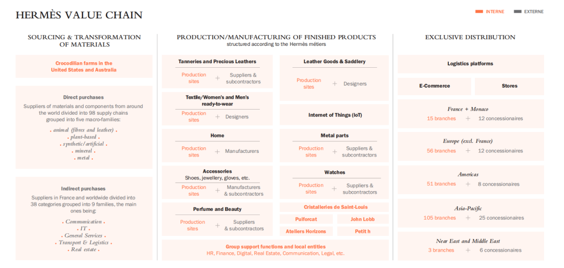 本文的结尾,《华丽志》特别选取了爱马仕最新年度报告中三份信息含量极高的图表来阐释爱马仕核心供应链的全球布局情况,包括 :1)爱马仕高度垂直整合的商业模式 2)爱马仕法国本土的重资产产能版图 3)爱马仕价值链全景生态图