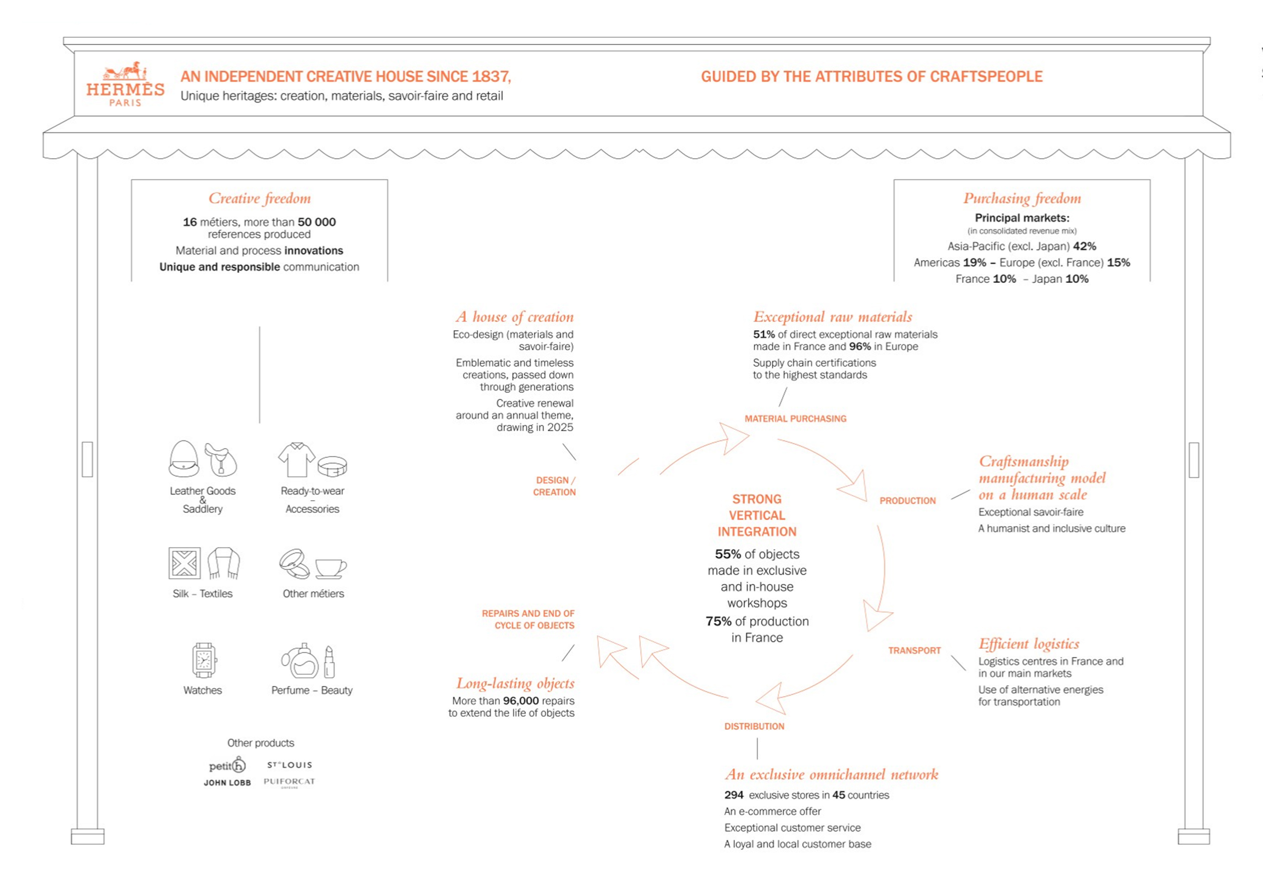 爱马仕直接收购这些小而美的独立历史名坊,并非单纯为了追求短期的规模扩张。正如年报中所展示的价值链结构,它们作为独立实体在爱马仕的生态中运行,将特定领域的极致手工技艺纳入了爱马仕的保护伞下,成为了集团整体生活方式产品线不可或缺的“技艺拼图”。