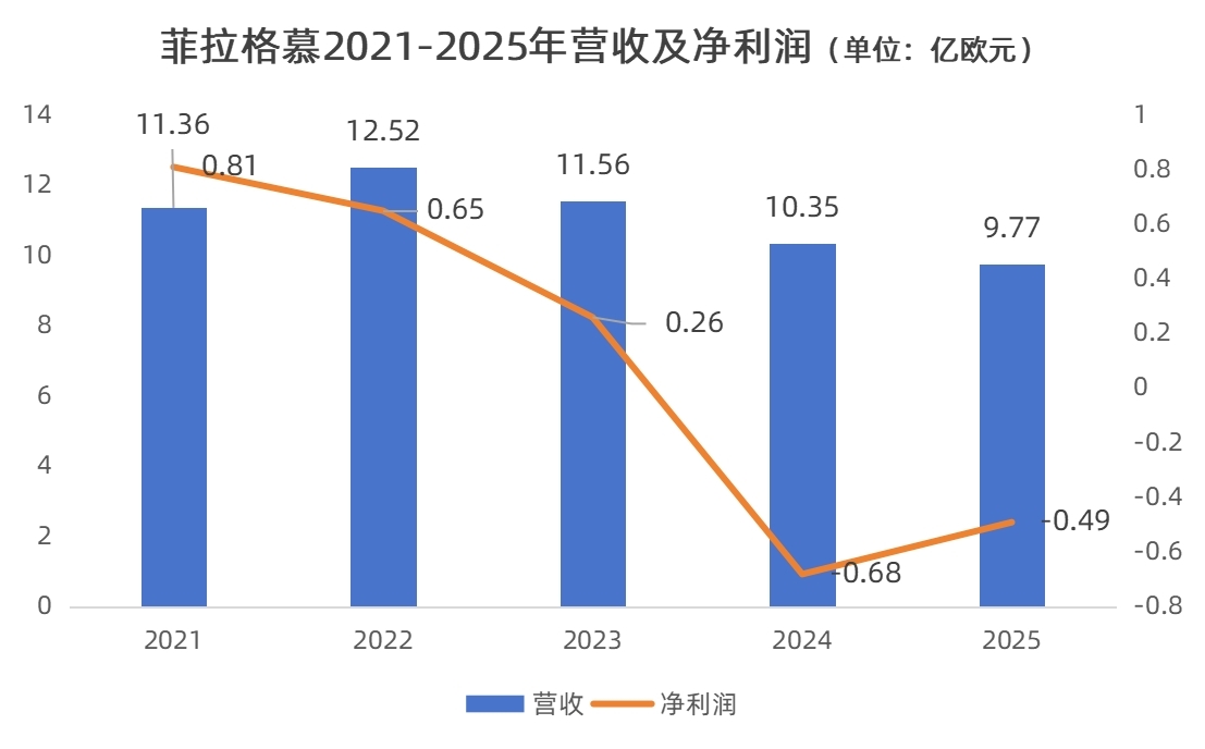 回顾菲拉格慕成为上市公司后大起大伏的股价走势:2011年6月,菲拉格慕以9欧元/股登陆米兰证券交易所,到2013年11月超过29欧元/股;此后则经历了巨大的波动,虽然期间在2015年3月时曾站上30欧元/股的历史高点,不过伴随业绩发展停滞,甚至持续下滑(过去五年业绩走势见下图),菲拉格慕的股价一路走低,在2025年8月曾跌至不足5欧元/股的历史性低谷。